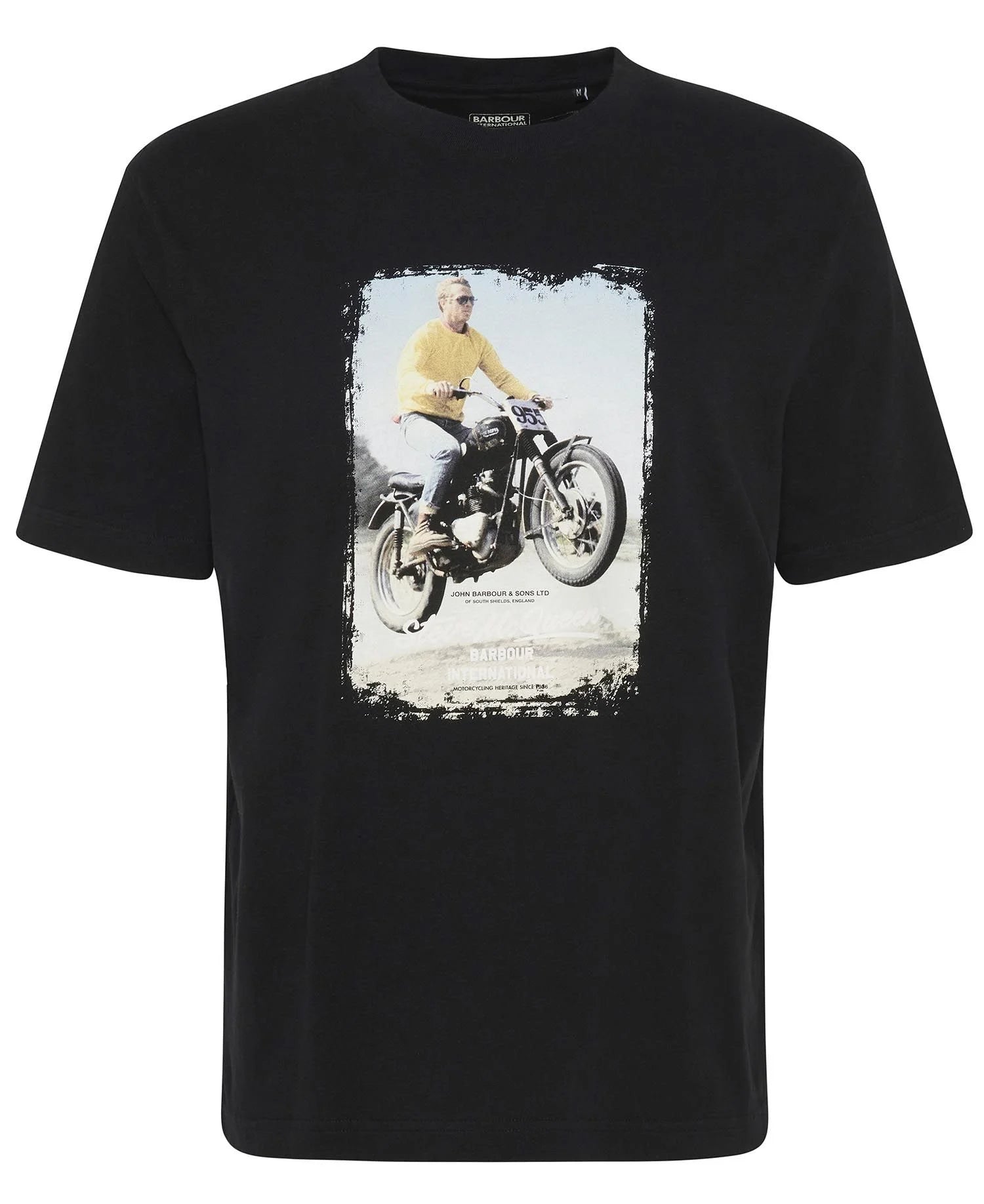 En 1964, Steve McQueen et le reste de l'équipe américaine se sont arrêtés à Londres pour acheter leurs costumes Barbour International et se sont rendus aux épreuves internationales de six jours de 1964 en Allemagne de l'Est. Rendant hommage à cette compétition emblématique, le t-shirt graphique B.Intl Coster présente un graphisme Steve McQueen de l'ISDT.