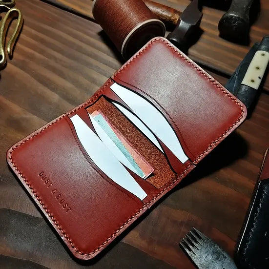 Ce porte-carte est composé de 3 compartiments pouvant accueillir vos cartes de crédit et 2 poches pour vos papier d’identité, cartes de visites et d'un rangement avec poche a soufflet pour votre monnaie et votre argent liquide. Les fournitures sont en laiton.