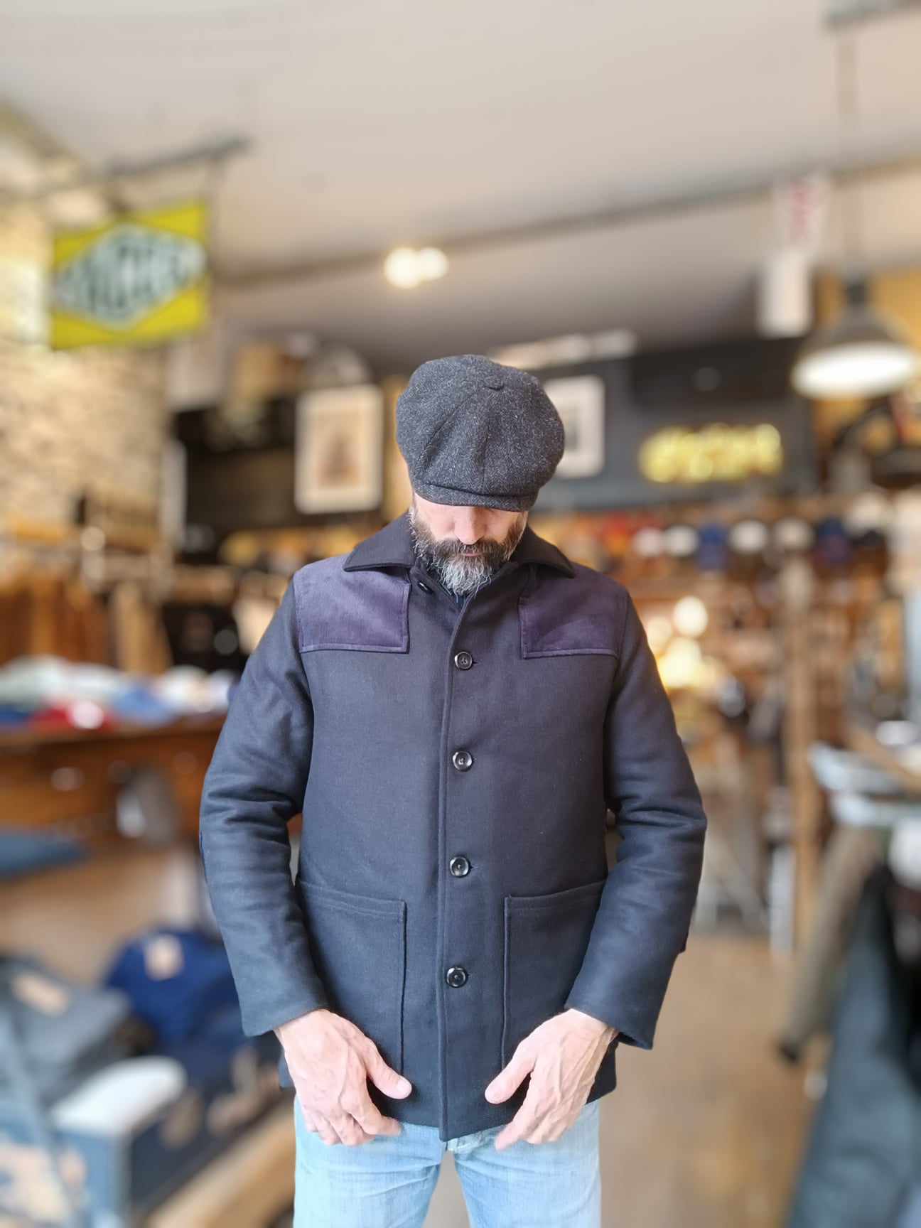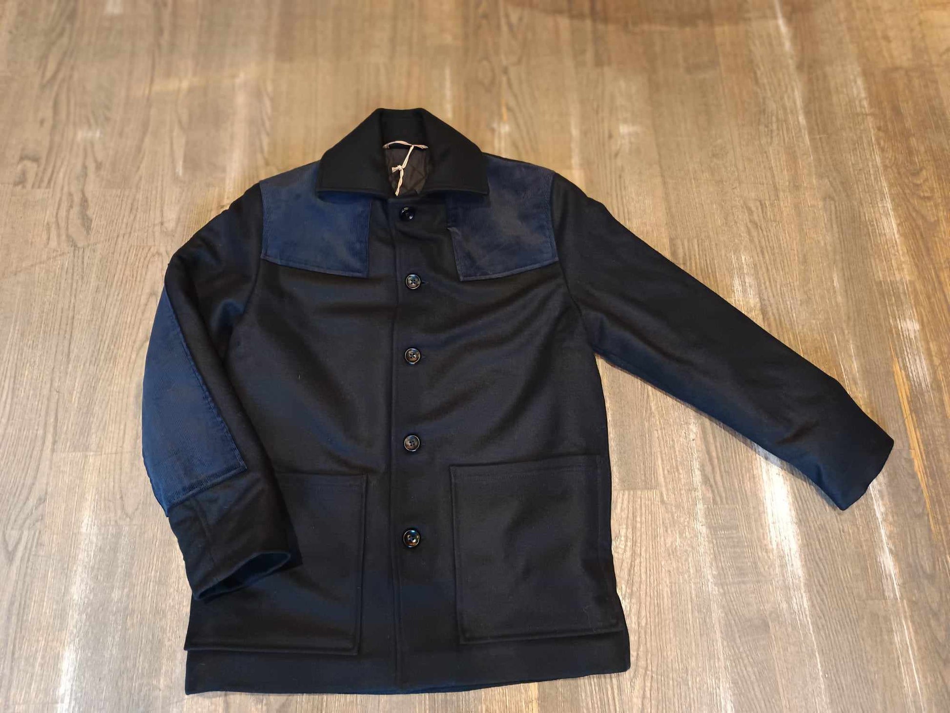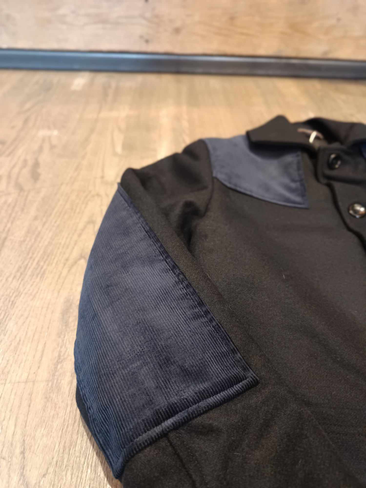 Manteau en laine avec empiècements velours aux épaules et aux coudes.