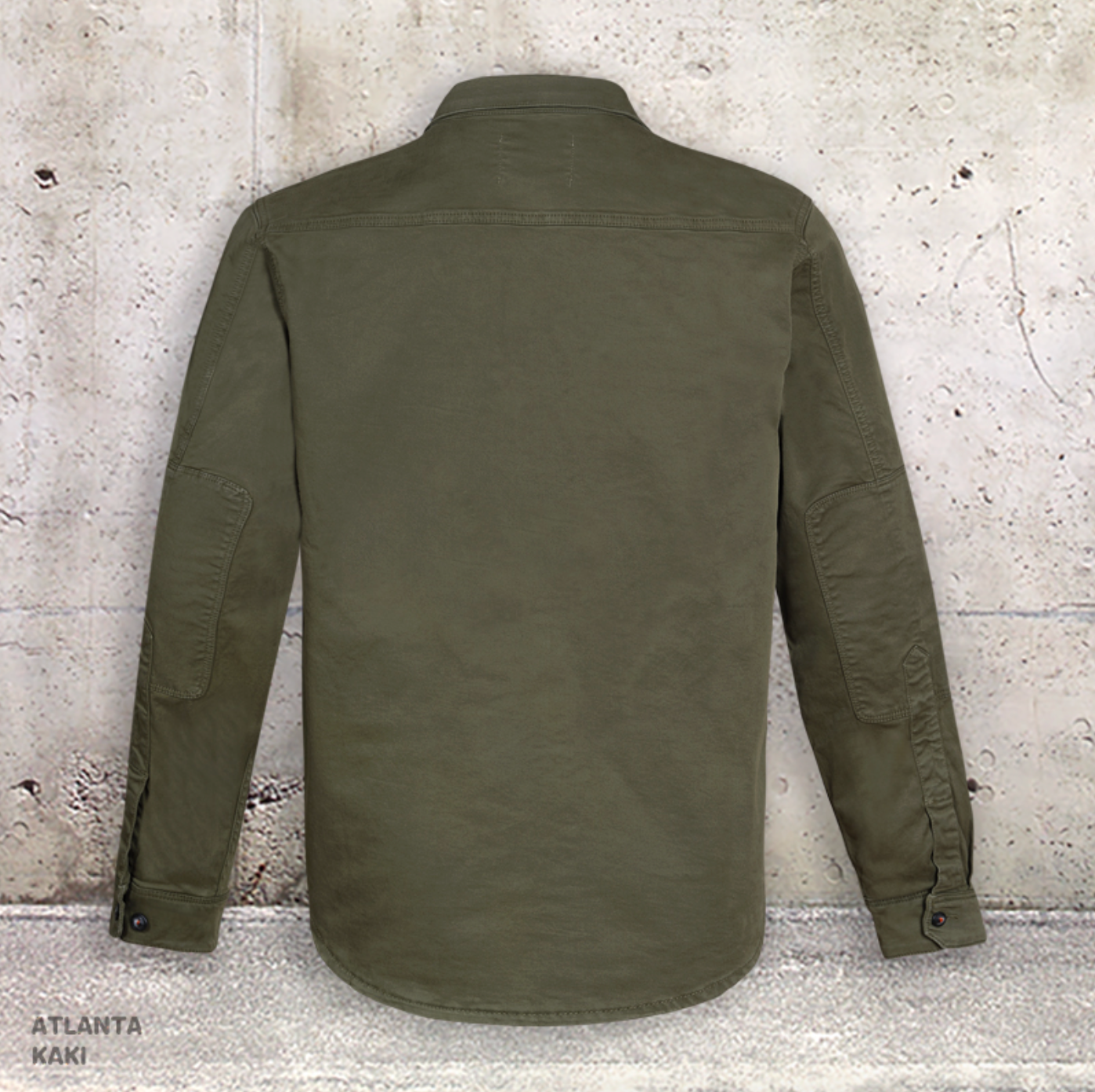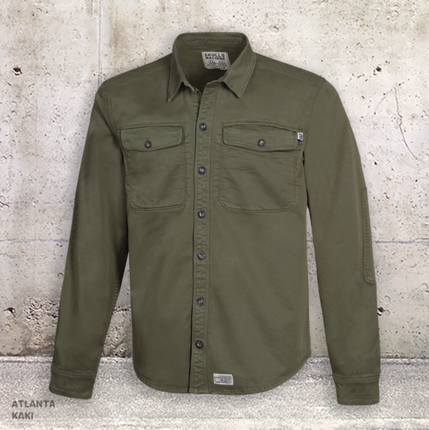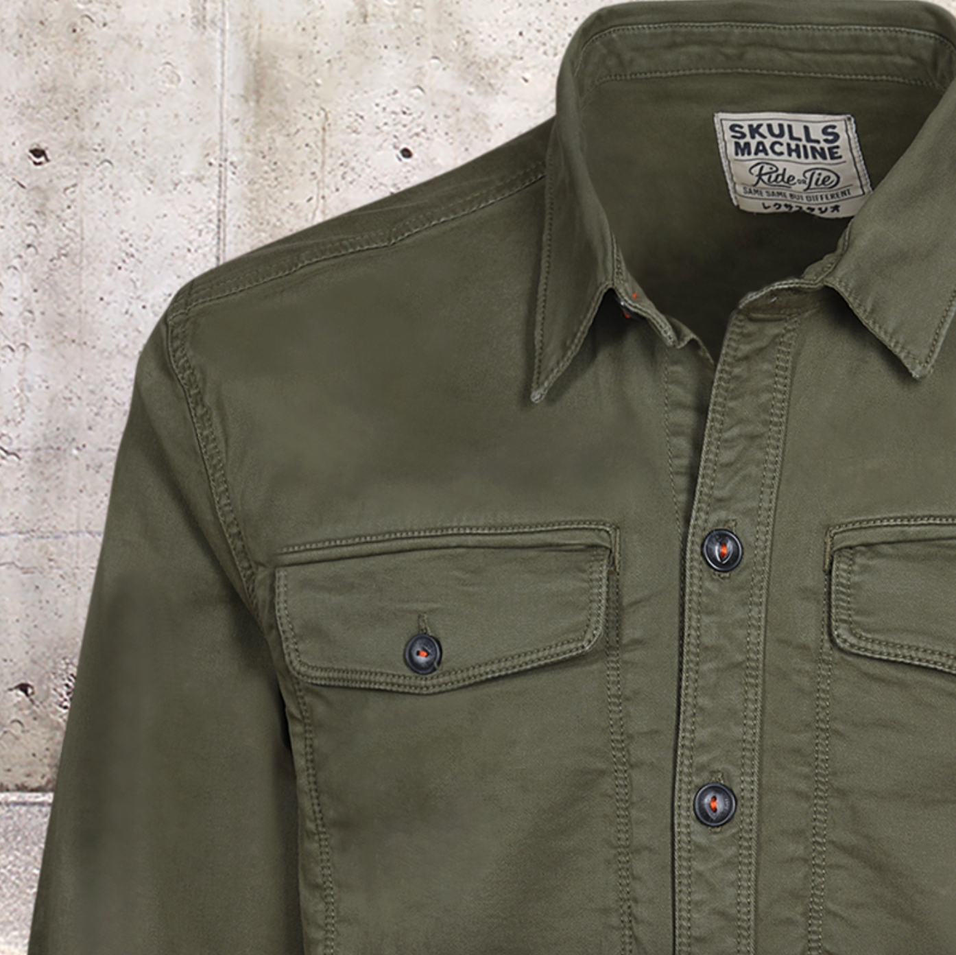 Surchemise militaire deux poches rabat à finition passepoilées avec boutons ceil de chat, col chemise fermeture à boutonnière, coudes renforcées, couleur effet vintage.